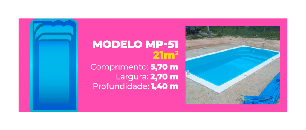Piscina de fibra Modelo MP-51 com 5,70m de comprimento e 1,40m de profundidade.